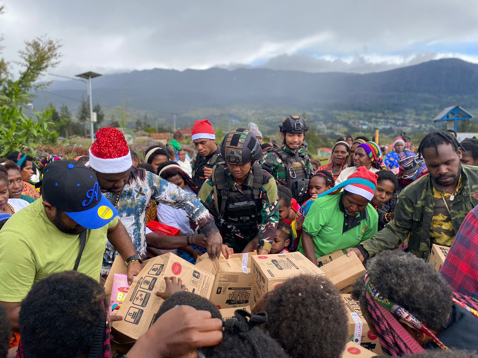 SUARA CIANJUR | PAPUA - TNI/Satgas Pamtas Mobile Raider 300/Brajawijaya Kodam III/Siliwangi yang beragama Kristen bersama Masyarakat Distrik Gome Papua rayakan hari Natal penuh sukacita.